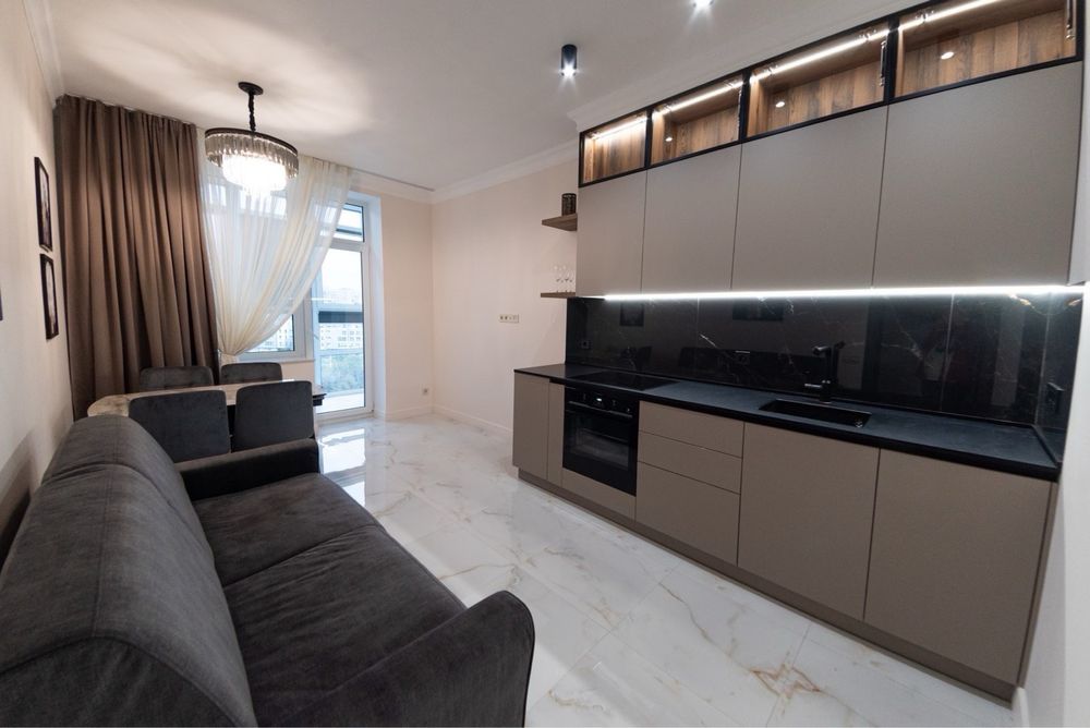 Преміальна 1 кімнатна квартира з дизайнерським ремонтом у ЖК «Сонячна Рів’єра», площею 54,5 м², розташована на 9 поверсі з 30 у сучасному житловому комплексі «Сонячна Рів’єра» за адресою: вул. Микільсько-Слобідська, 3Б, Дніпровський район, Київ. Поруч річка Дніпро.