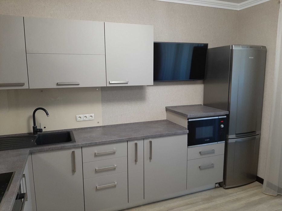 На кухні: холодильник, плита, духова шафа, витяжка, мікрохвильова піч та необхідні кухонні меблі.