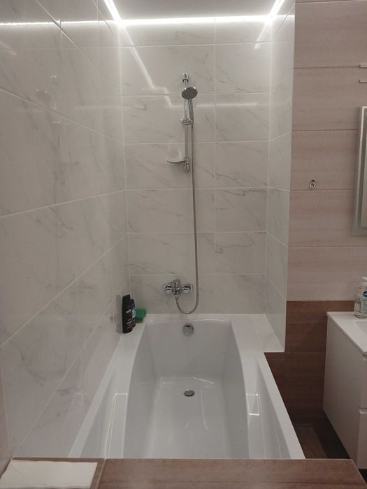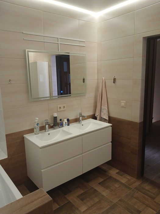 3) Санвузол: загальна площа – 6.80м.кв.; висота стелі – 2.53м.(натяжна); основне освітлення – ЛЕД по периметру стелі, додаткове – підсвітка на дзеркалі; встановлено: підвісний спарений рукомийник(облаштований) з подвійною тумбою; пенал підлоговий; ванна акрилова(облаштована); унітаз; гігієнічний душ; рушникосушка; примусова витяжка; підлогова та настінна плитка; вивід води та злив під встановлення пральної машинки;; розетки та вимикач;