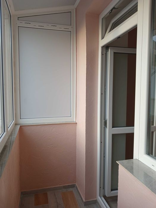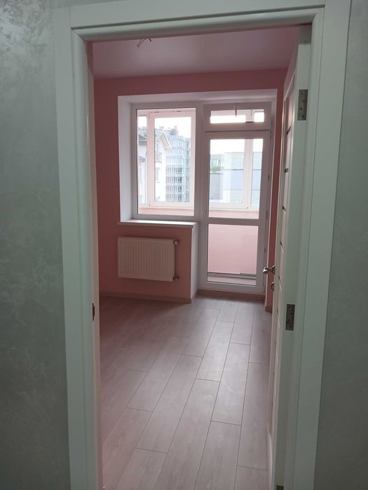 2) Кімната 1 з балконом та видом на західнопівденний напрямок: загальна площа – 10.30м.кв. із заскленим балконом на 2.50м.кв., де встановлено підлогову плитку, а стіни пофарбовано під короїд та покрито лаком; висота стелі – 2.65м(натяжна під один світильник); встановлено: ламіноване підлогове покриття; стіни фарбовані; радіатор опалення двореберний(сімдесятка); розетки та вимикачі;