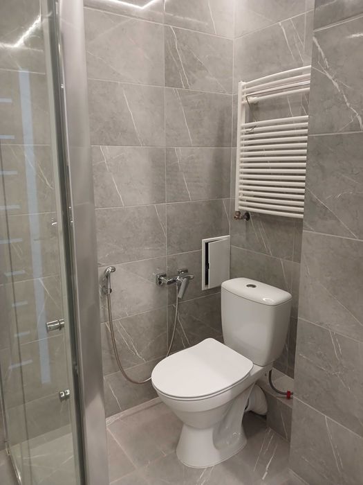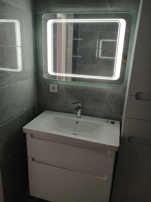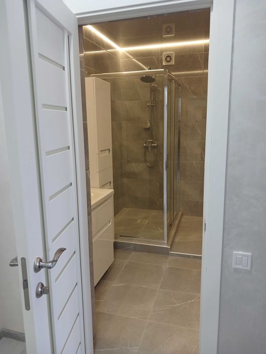 5) Санвузол 1: загальна площа – 5м.кв.; висота стелі – 2.53м.(натяжна); основне освітлення – ЛЕД по периметру стелі, додаткове – підсвітка на дзеркалі; встановлено: рукомийник(облаштований) з підлоговою тумбою та пеналом; душова кабіна підлогова(облаштована); унітаз; гігієнічний душ; рушникосушка; примусова витяжка; водяний лічильник; підлогова та настінна плитка; розетка та вимикач;