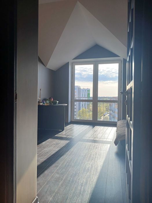 4) Кімната 3 з балконом та видом на східнопівденний напрямок: загальна площа – 21м.кв. із заскленим балконом на 1.60м.кв., де встановлено підлогову плитку, а стіни пофарбовано під короїд та покрито лаком; висота стелі – 2.65м(натяжна під один світильник); зі сходовою на другий рівень(ширина проєму – 0.80-0.95м, на 19 сходинок, з освітленням на два світильники); встановлено: ламіноване підлогове покриття; стіни фарбовані, частково венеціанкою; кондиціонер; радіатор опалення двореберний(стосороківка); розетки та вимикачі;