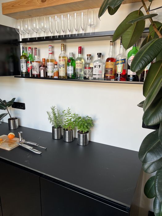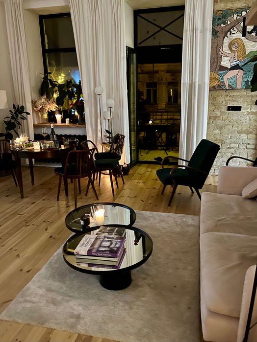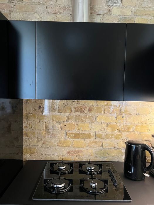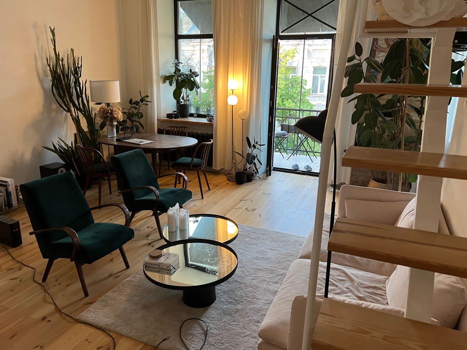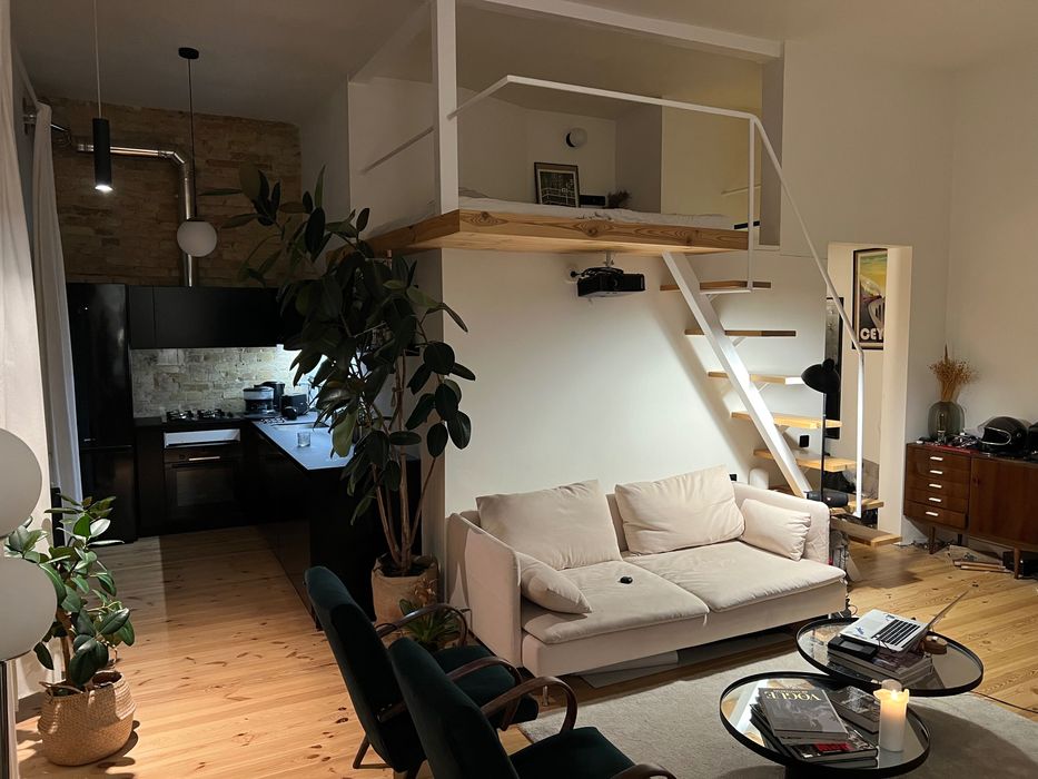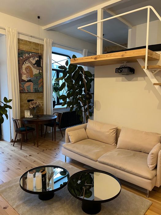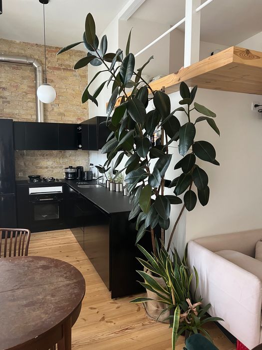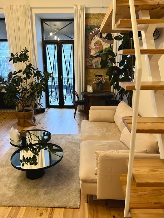 50 квадратних метрів, студія, висота стелі 3.5м, спальне місце на другому поверсі. Новий ремонт, деревʼяна підлога, вся техніка вбудована і якісна:прально-сушильна машинка, посудомийка, електрична духовка
