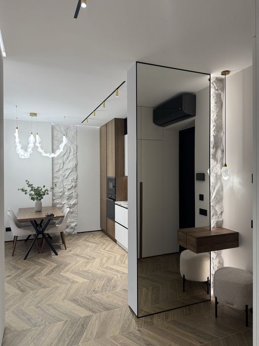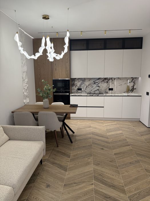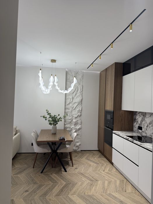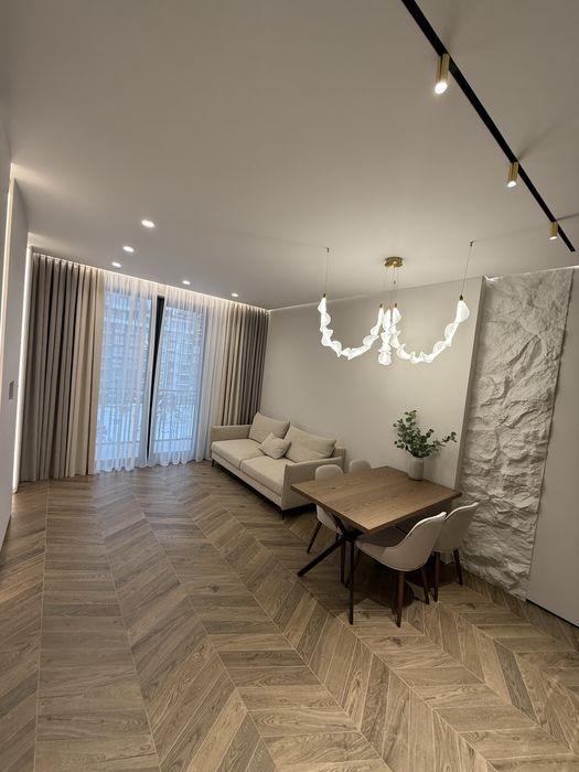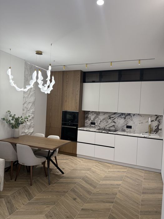 Квартира з дизайнерським ремонтом, виконаним у сучасному стилі з використанням преміальних матеріалів. Продумане планування: простора кухня-вітальня, 2 окремі спальні кімнати із панорамними вікнами у внутрішній закритий двір та функціональний санвузол.