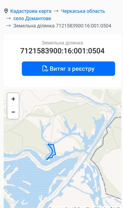 Продаж земельної ділянки; Продаю земельну ділянку яка перебуває у приватній власності, розташована в мальовничому місці с. Домантово, Золотоніського району, Черкаської області. Цільове призначення земельної ділянки 01.03 "для ведення особистого селянського господарства", категорія земель "землі сільськогосподарського призначення". Площа земельної ділянки 1,817 га, кадастровий номер 7121583900:06:001:0504.