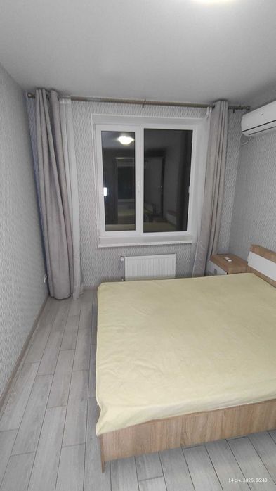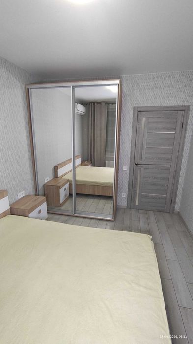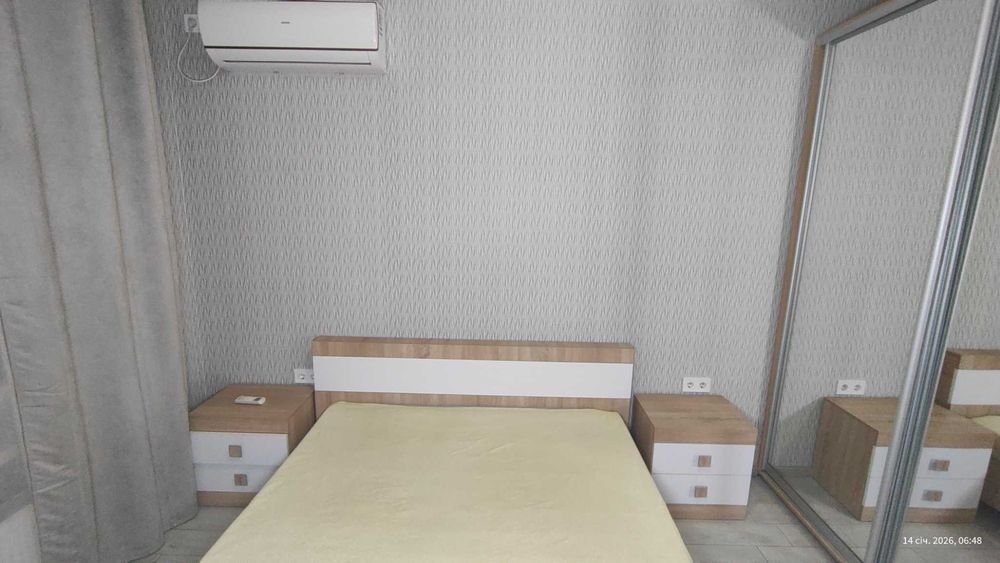 Затишна спальня площею 11.6 м² повністю укомплектована сучасними меблями: великим двоспальним ліжком з надійною основою, двома при ліжковими тумбами та місткою шафою-купе. У кімнаті встановлена потужна спліт-система (кондиціонер), що забезпечить прохолоду влітку, а сучасний радіатор під вікном гарантує тепло взимку а світлі фактурні шпалери, сучасні міжкімнатні двері у світлих тонах створюють атмосферу легкості та чистоти.