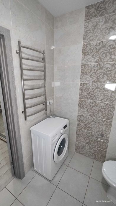У санвузлі стіни та підлога викладені сучасною широкоформатною плиткою у світлих бежевих тонах, вже встановлена та підключена якісна пральна машина. Також є електрична рушникова сушка, що забезпечує комфортну температуру та сухість у приміщенні, ще є повноцінна ванна з душовою системою, компактний унітаз та ергономічна тумба під раковиною, яка забезпечує додаткове місце для зберігання побутових дрібниць також над раковиною встановлено сучасне дзеркало з підсвіткою.