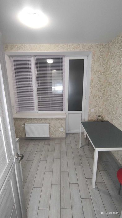 Велике вікно наповнює кімнату природним світлом. Вже встановлені карнизи зі шторами та тюлем, що дозволяють легко регулювати рівень освітлення.