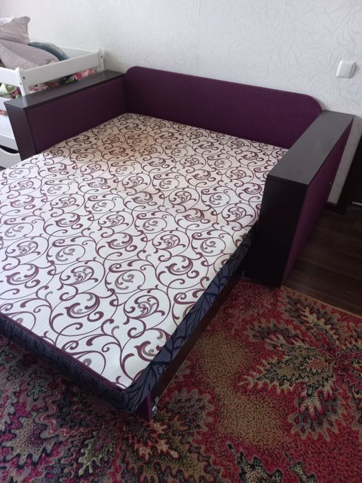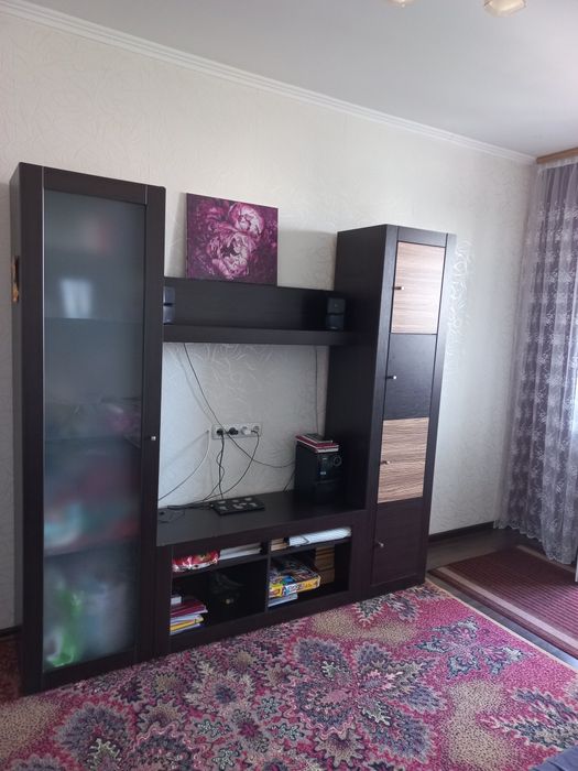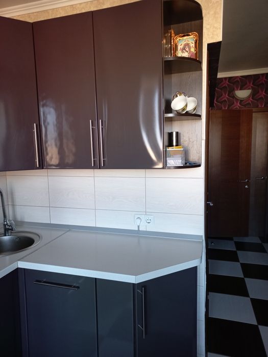 Святошинський; Симиренка 14 Б біля трамваю; Квартира з ремонтом. Є посудомийка. Дві лоджії: вихід з кімнати (твм письмовий стіл) і кухні (там холодильник і шафа в якості кладовки. В кімнаті один диван, шафа, "стєнка", без дитячого ліжка як на фото.