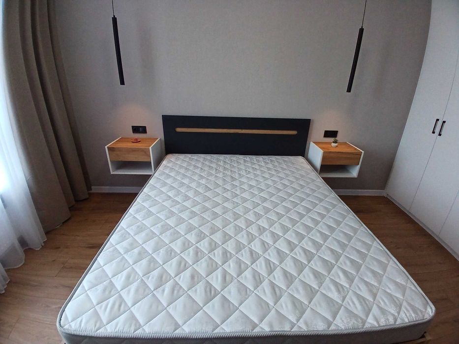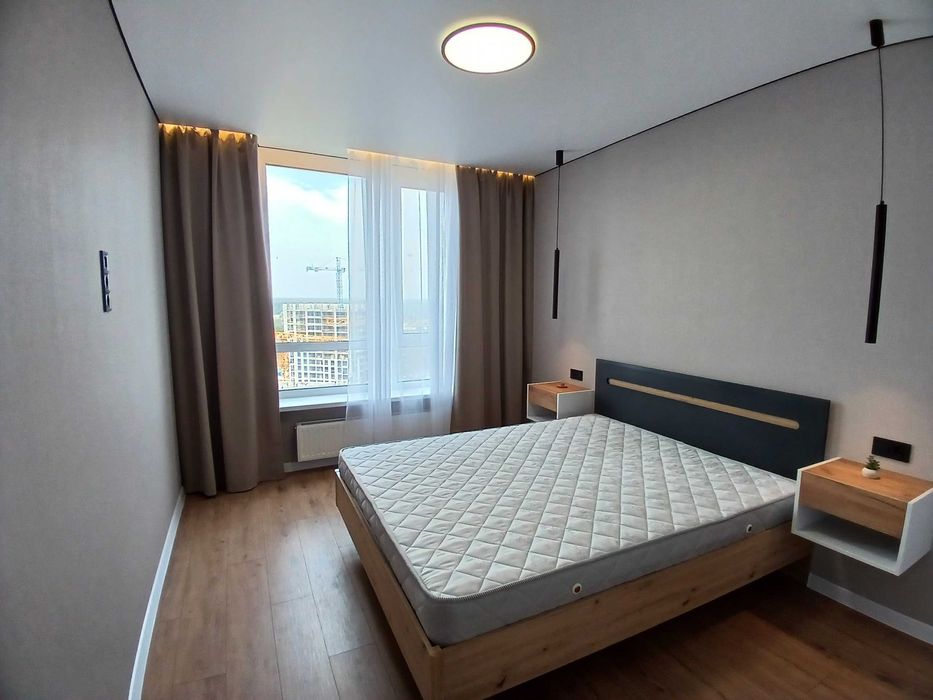 Квартира повністю оснащена для комфортного проживання: у спальні ліжко та шафа, у кухні-вітальні розкладний диван, телевізор, кондиціонер, а також кухня з індукційною варильною поверхнею, духовкою та холодильником. Санвузол суміщений, обладнаний бойлером для гарячої води. По всій квартирі встановлена тепла підлога.