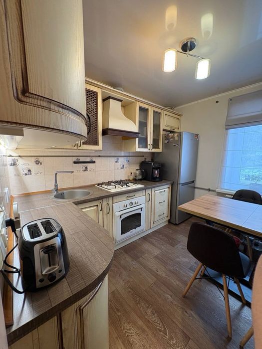 Кухня - мебель з покриттям патіна; - стіл з якісного дерева, стільці; - вбудована газова варильна поверхня; - вбудований електричний духовий шкаф; - витяжка; - холодильник.