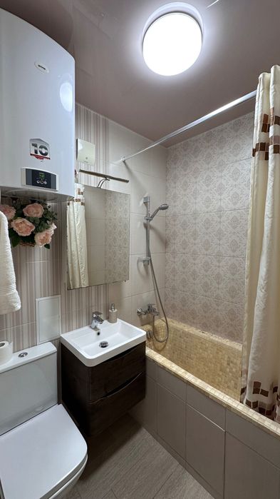 Горячая вода — от бойлера (установлен), есть счётчик на холодную воду. Свет есть всегда.