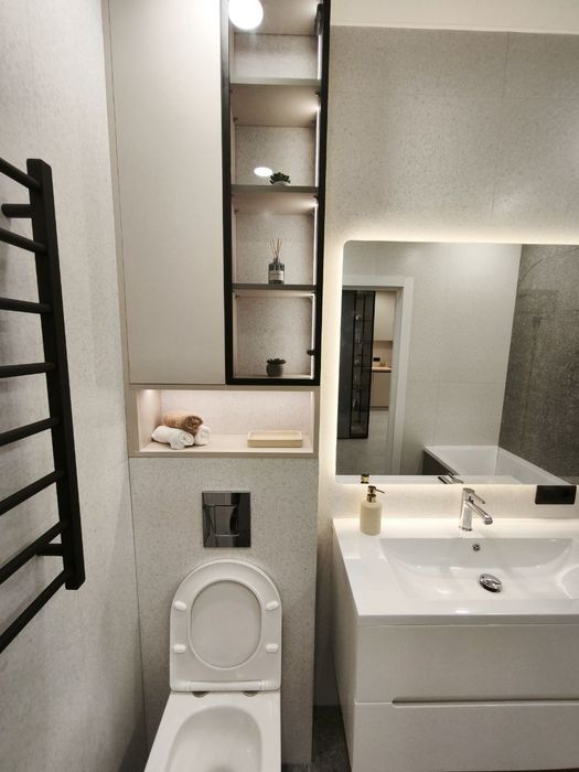 Сан вузол: ванна з підсвіткою, інсталяція, дзеркало с під світкою, сушарка для рушників, бойлер на 80 л. з двома сухими тенами, великий умивальник, ванна та гігієнічний душ, пральна машина, сушильна машини
