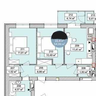 Загальна площа 54,86 кв.м., житлова 22,4 кв.м., кухня 11,41 кв.м.