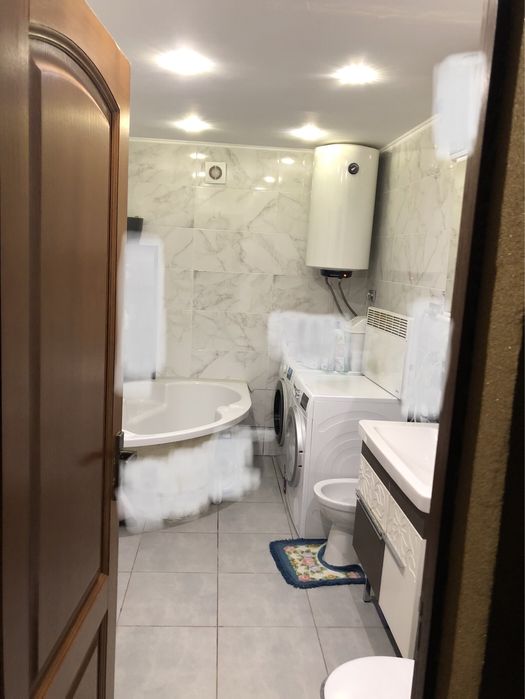 В ванній кімнаті є велика кутова вана,біде,великий умивальник з тумбами та дзеркалом,унітаз .