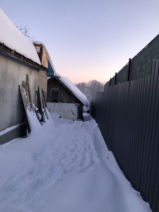 Будинок весь огороджений сірим парканом та город сіткою