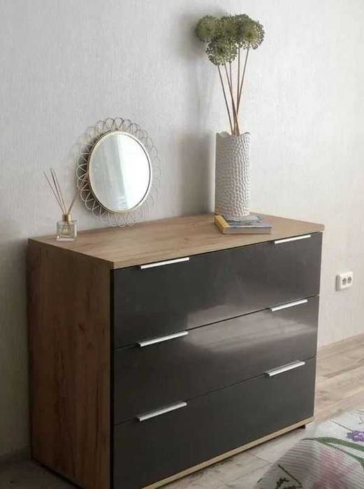 Спальня: ліжко 160×200 з підсвіткою і ортопедичним матрацом із двома рівнями жорсткості, 3-дверна шафа, комод.