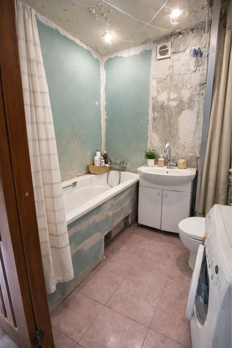 В ванной влитка только на полу. Не успели сделать ремонт. В ванной нужно класть плитку на стены.стены подготовлены под плитку.