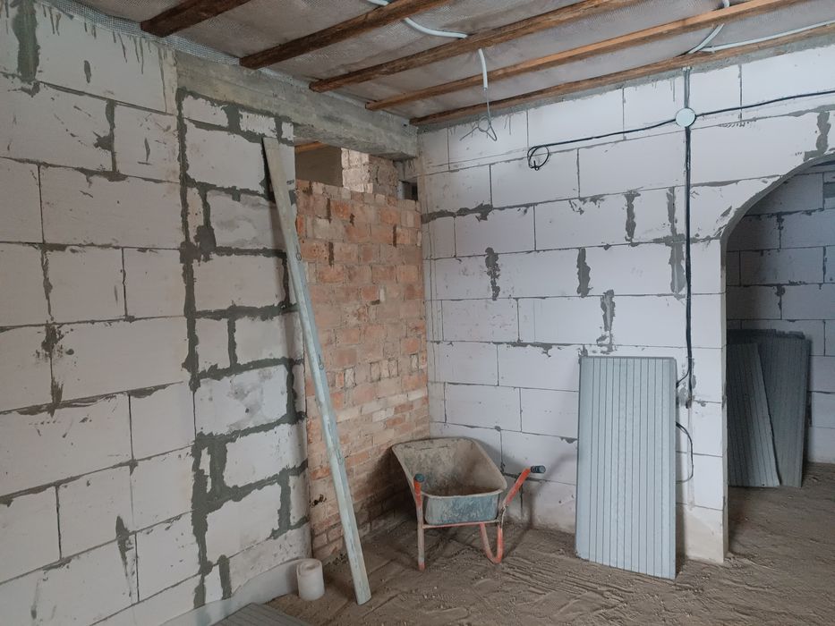 Проведене освітлення по будинку та тираси, поштукатурина, чорнова підлога, встановленні дві річки, стеля утепленна мінватою.