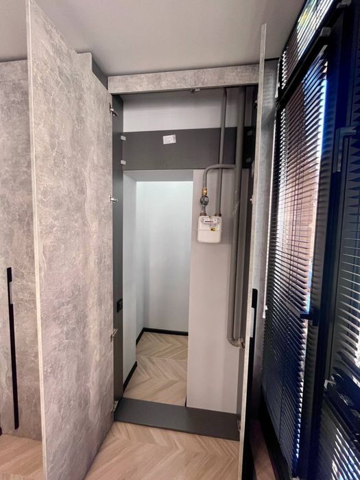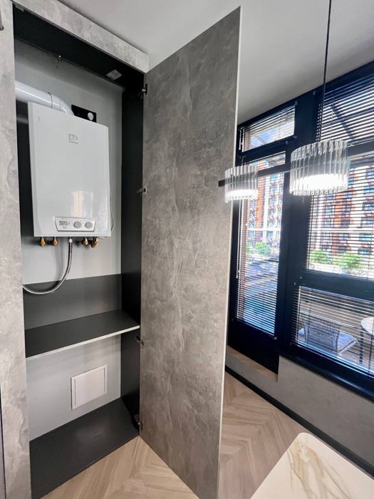 Тепла водяна підлога на кухні та в ванній, індивідуальне газове опалення (двоконтурний газовий котел). Кімната простора, світла та має велику гардеробну. Є кладовка. Повністю облаштована тераса - сучасний алюмінієвий навіс, є меблі для тераси (стільці, столик, крісло-кокон).