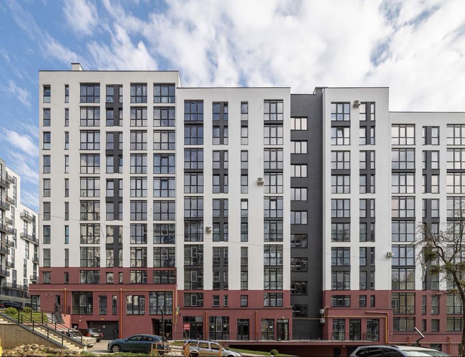 1-й поверх над паркінгом — по факту виглядає як 2-й (високо, комфортно).