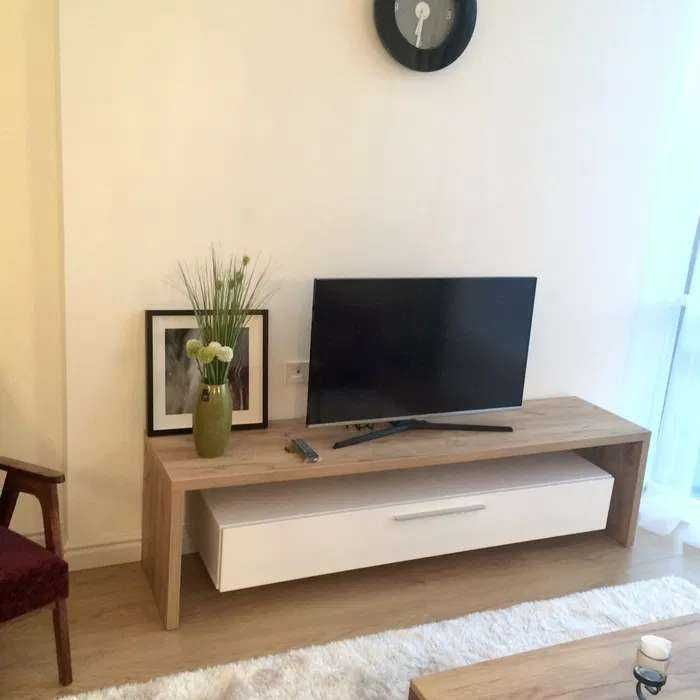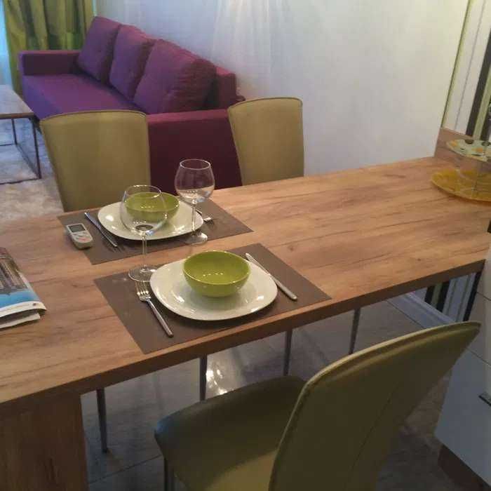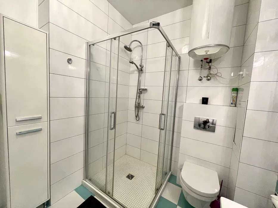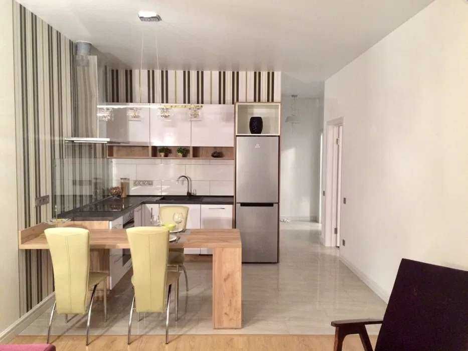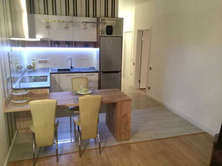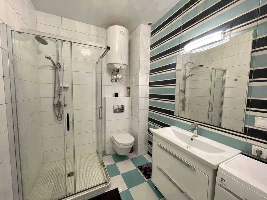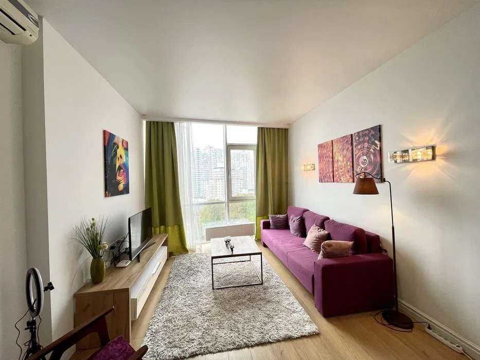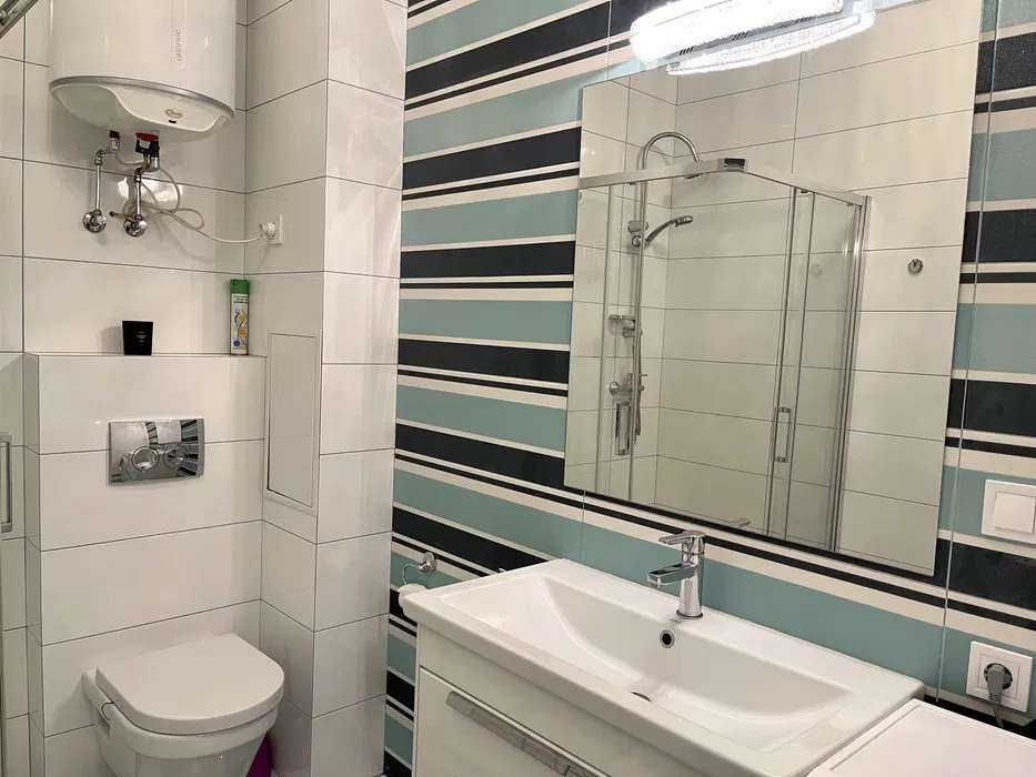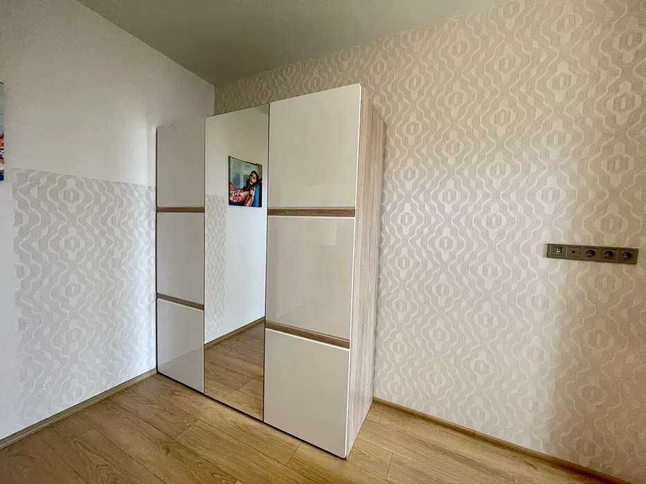 Квартира зручно спланована: передпокій, гардероб, санвузол з душовою кабіною, кухня-вітальня та спальня з балконом. Повністю укомплектована меблями та технікою: тепла підлога, домофон, бойлер, електроплита, духовка, холодильник, мікрохвильова, посудомийна машина, телевізор і кондиціонери.