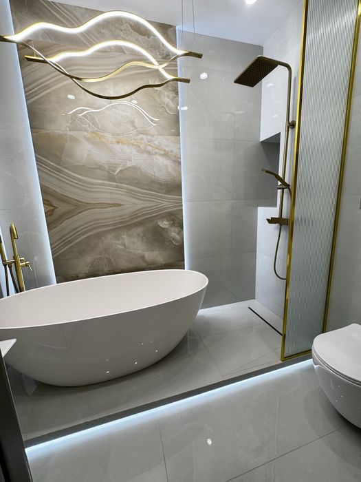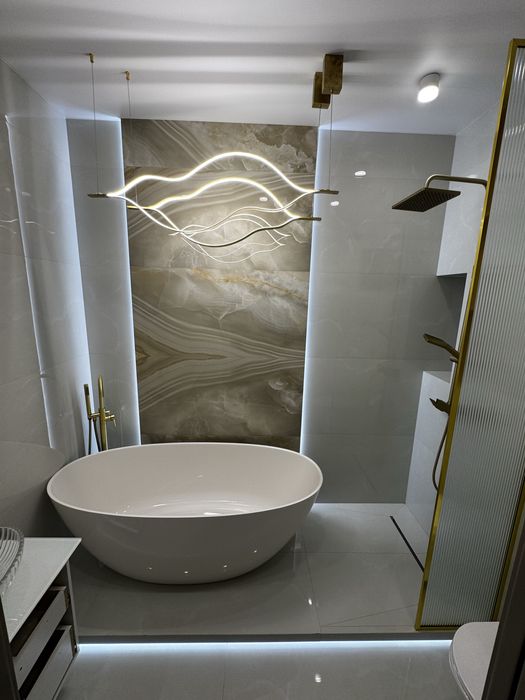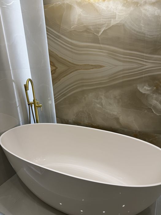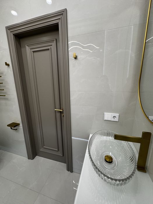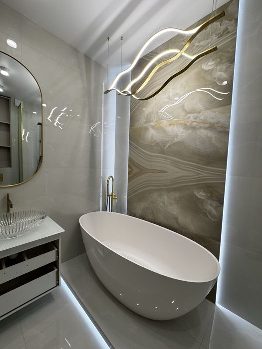 В отделке использованы инженерная доска, система тёплого пола, межкомнатные двери из массива натурального дерева. Интерьер дополняет отдельно стоящая ванна из искусственного камня — выразительный акцент, подчёркивающий эстетику и уровень комфорта. Квартира полностью укомплектована мебелью и техникой Whirlpool и Gorenje.
