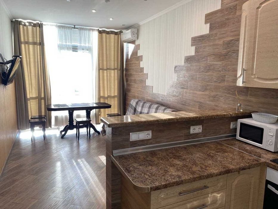82 кв. м на 8 поверсі 25-поверхового будинку: дві повноцінні спальні, кухня-студія, два санвузли (з ванною і душовою). Підлога, двері, меблі, внутрішній інтер’єр з натурального дерева. Сучасна побутова техніка. Два кондиціонери. Два бойлери. Підлога з підігрівом. Лічильники на комунальні послуги. Радіатори обладнані термодатчиками.