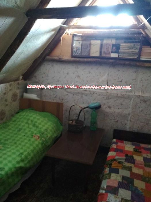 На 2м этаже комната (мансарда) с балконом. Площаль общая (мансарда равна площади 1го этажа. Жилая площадь около 10м2 (на фото две кровати и журнальный стол).