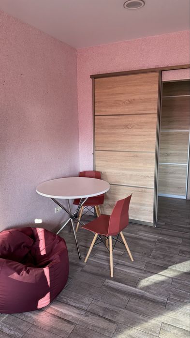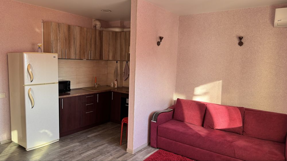 Загальна площа - 46 м². Квартира-студія повністю укомплектована всім необхідним для комфортного життя: бойлер, пральна машина, чайник, мікрохвильовка, телевізор, Wi-fi, кондиціонер. Є невеликий балкончик. Шкаф вбудований в коридорі.