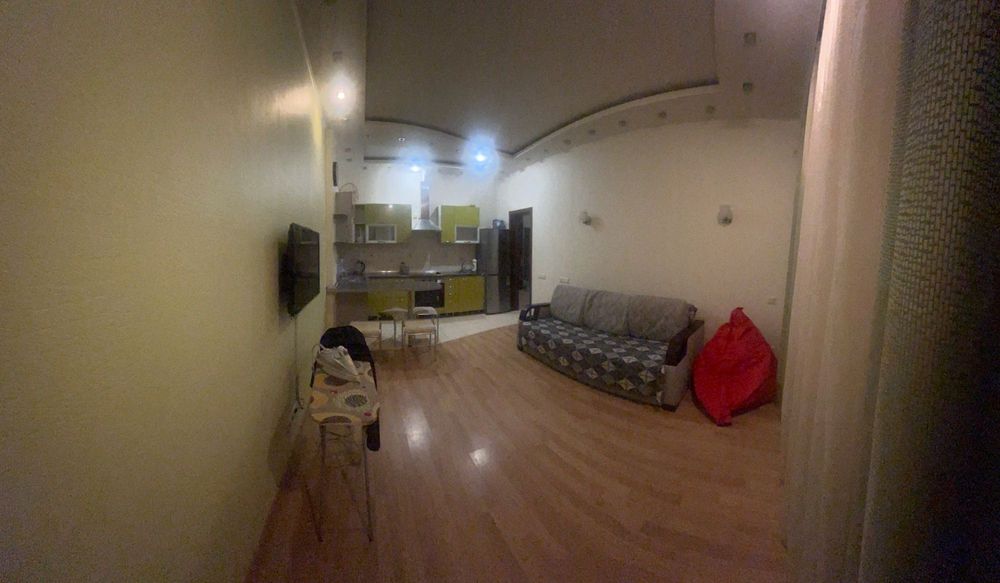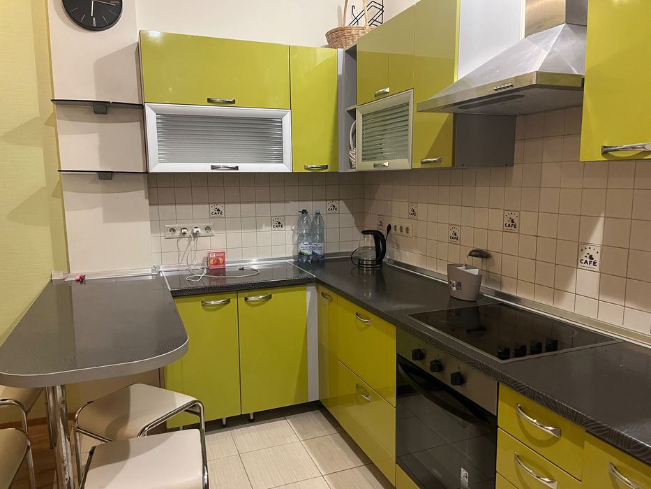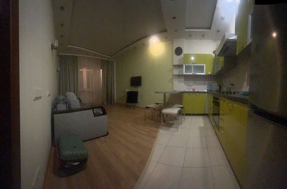 Кухня-студія площею близько 24 кв.м простора та дуже містка. Кухонні меблі дозволяють розмістити всі необхідні речі. Є холодильник, варильна панель, духовка — все у справному стані. В зоні відпочинку встановлено Smart TV з телебаченням, великий розкладний диван та крісло. Інтер’єр виконаний у цікавому дизайнерському стилі, що створює відчуття тепла і комфорту.