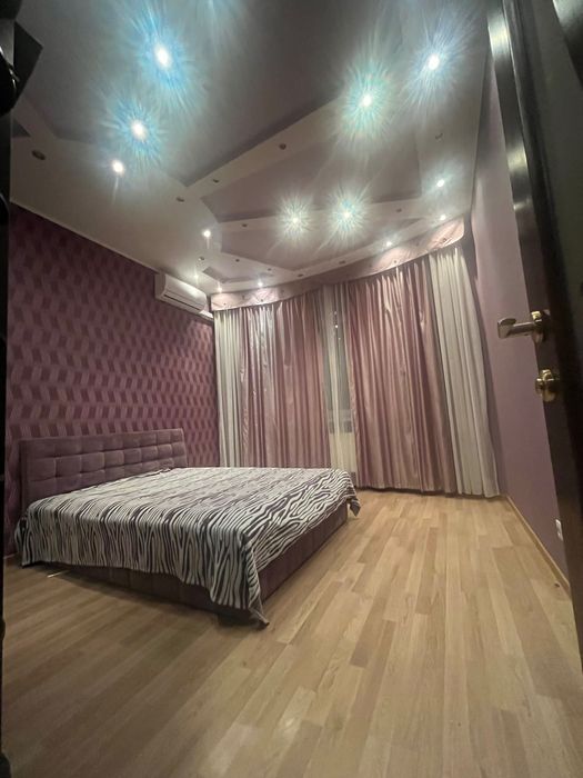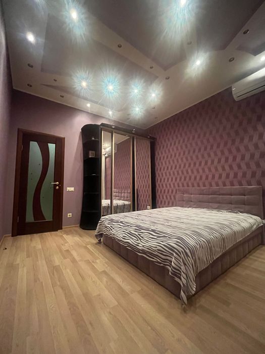 Спальня оформлена з дизайнерським підходом: красива стеля у формі сонця створює особливу атмосферу. Велика дзеркальна шафа-купе та ліжко з підйомним механізмом дають багато додаткового місця для зберігання. У цій кімнаті відчувається спокій, затишок і відчуття дому.