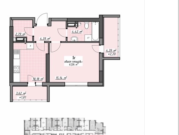 площадь 41,00кв.м с гардеробной и двумя балконами,