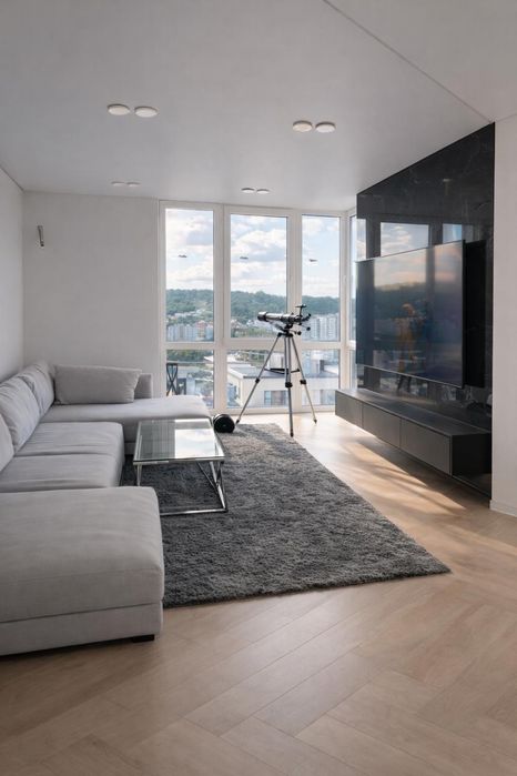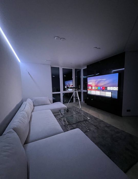 Простора вітальня, яка розділена на сучасну лаундж-зону з великим 86”дюймовим екраном та обідню зону на 6 персон.