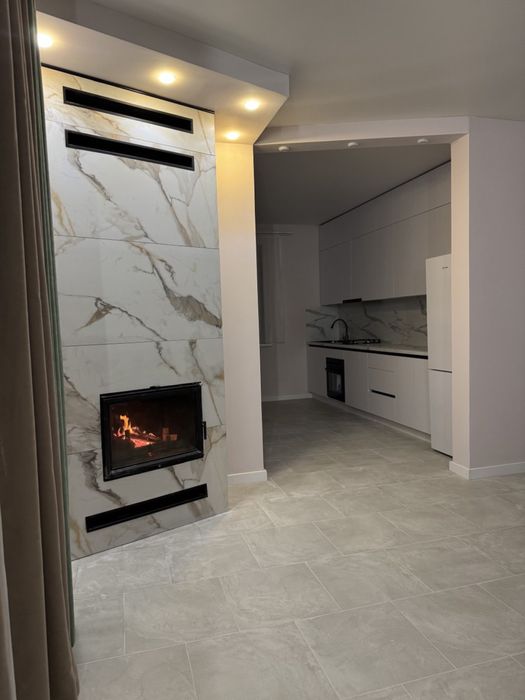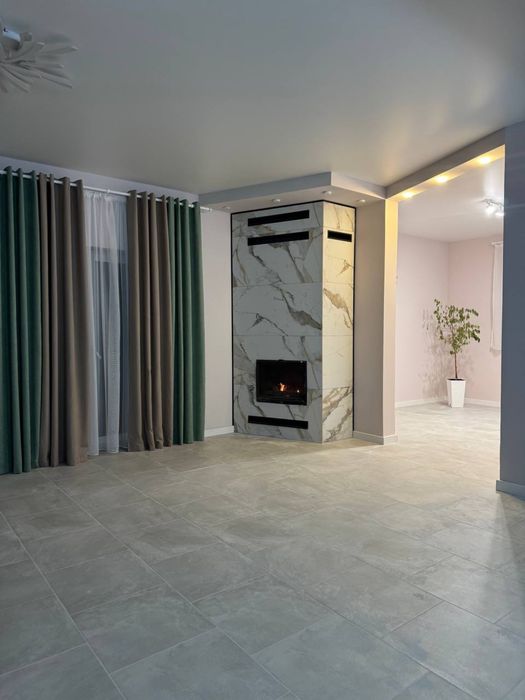 — простора вітальня з каміном на дровах