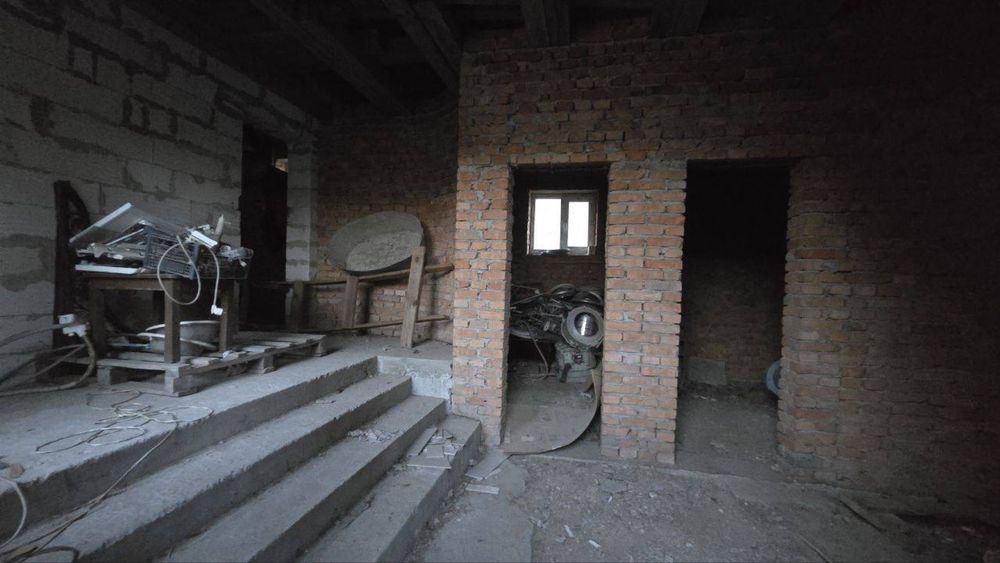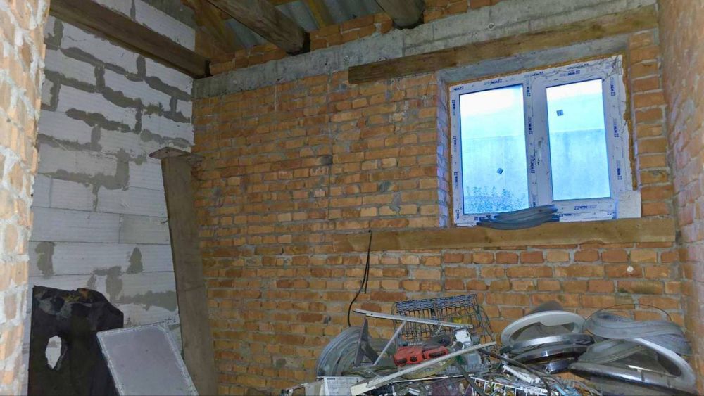 Выстроен из красного кирпича, установлены крыша , окна. По планировке 3 раздельные комнаты, кухня, санузел. Есть возможность обустроить мансардный этаж.