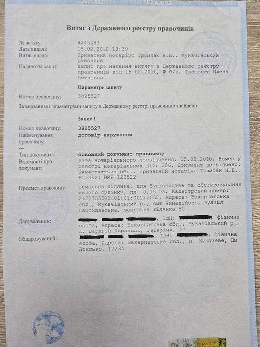 Локація: Закарпатська обл., Мукачівський р-н., смт. Чинадієво, вул. Партизпнська.