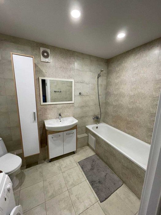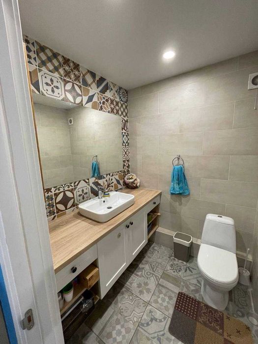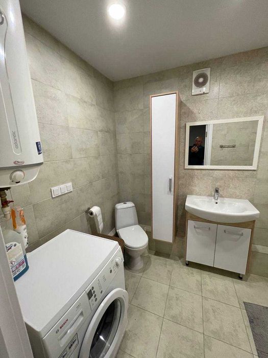 Ванна кімната: туалет, ванна, пральна машинка Bosch (велика, повноцінна на 7 кг, німецької збірки), бойлер на 150 л, умивальник з тумбою, примусова витяжка. Сантехніка стоїть високої якості, зроблено для себе. Тепла підлога.