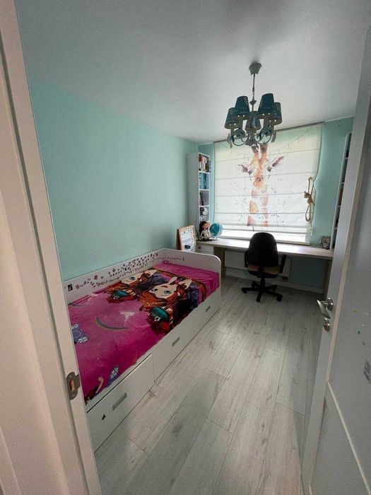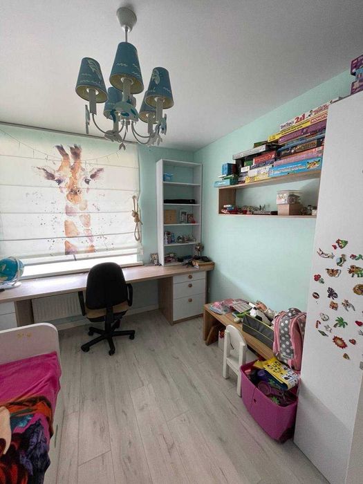 Дитяча кімната: ліжко з новим матрацом, шафа, великий стіл з тумбами (все робилося на замовлення), елементи меблі з масиву ясена.