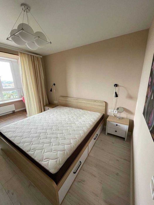 В кімнаті є великий шкаф та комод в зоні вітальні; великий і дуже зручний диван, який має можливість розкладатися в двоспальне спальне місце, смарт-телевізор, кухонний овальний стіл (можна розкладати та зробити його довшим) та стільці; сучасна кухня (системи з дотягувачами дверцят та шухляд фірми Blum), вмонтована газова поверхня та духовий шкаф (Gorenje), витяжка, посудомийка велика повноцінна (Siemens), великий холодильник (Samsung).