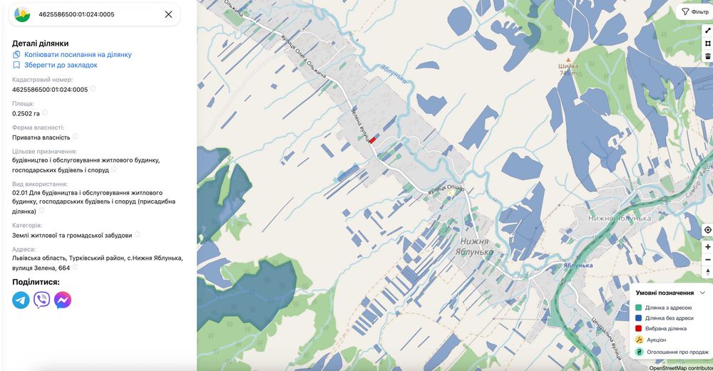 Продаж ділянки с.Нижня Яблунька 0.45 га; Продається дві ділянки загальною площею 0.45 га - 0.25 під будівництво та 0.2 осг. На ділянці є старий будинок в нежитловому стані. Поруч річка, ліс. Мальовнича природа.; кадастровий номер: 4625586500:01:024:0005, 4625586500:01:024:0004