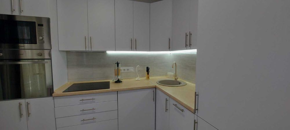 Кухня зі всією побутовою технікою: варильна поверхня, духовка шафа, велика пралка, посудомийка, холодильник, бойлер - все вмонтоване по дизайнерському проєкту.
