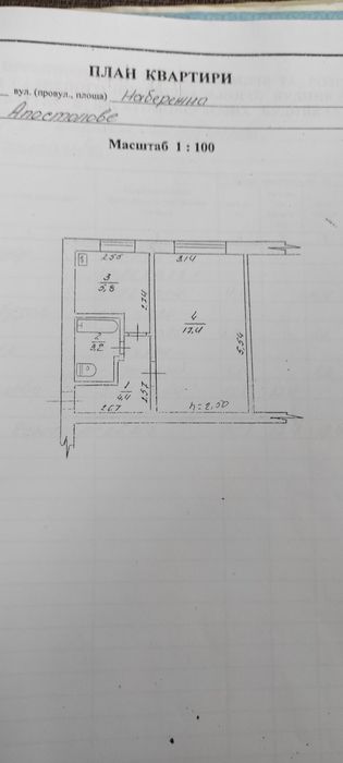 Продам 1-к. квартиру. Центр міста.; Квартира майже в центрі м. Апостолове ( вул. Набережна ). Однокімнатна, без ремонту, без меблів . Є лічильники на газ,воду, е/е ( день/ніч). Перший поверх, пластикові вікна. Є газова плита і колонка ( по документам). Опалення немає