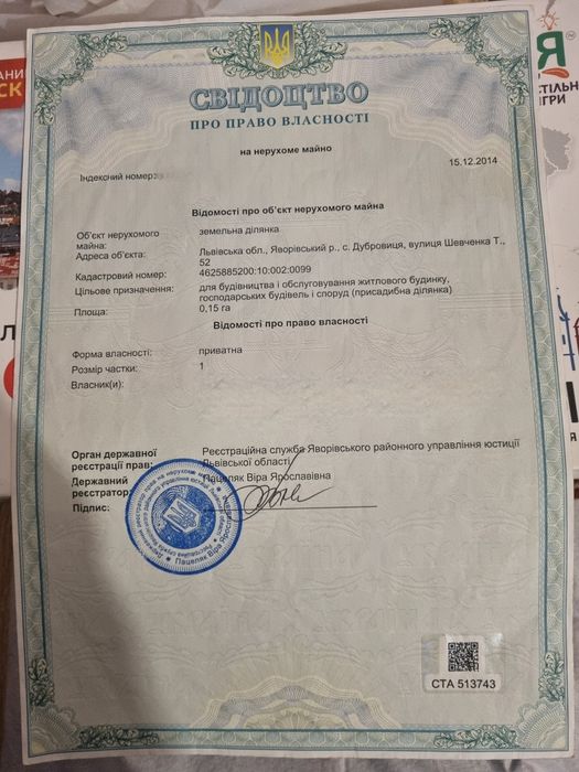 Продам земельну ділянку для будівництва Львівська обл., с Дубровиця; Продам земельну ділянку для будівництва за адресою Львівська обл., Яворівський р., с.Дубровиця, вулиця Шевченка Т.52