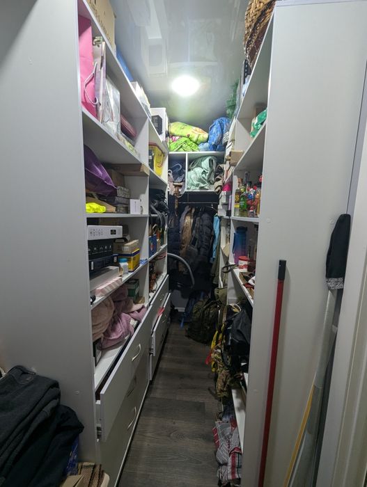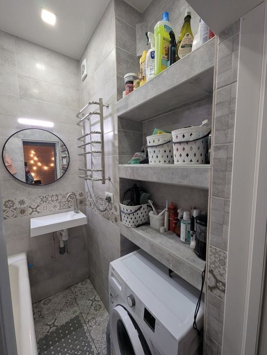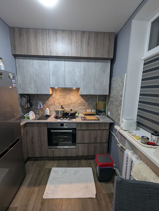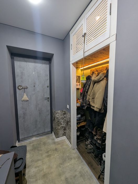 Квартира вирізняється ергономічним плануванням. Вбудована кухня з високою стільницею та антресолями до стелі забезпечує максимальний комфорт. Також є містка гардеробна-кладовка, що дозволяє ефективно зберігати речі та уникати захаращеності.