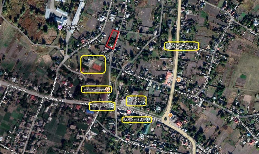 Зручне місце розташування у самому центрі села. Уся інфраструктура у пішій доступності. Поряд магазин Фора, школа за два будинки, Нова Пошта, Укрпошта, аптека, кафе, ринок, церква, різні магазинчики, автобусна зупинка та центральна автодорога. Земля чернозем.