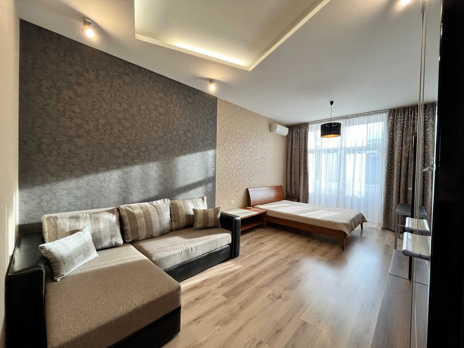 Холодильник, мікрохвильова піч, плита з духовкою, бойлер, електрочайник, пральна машина, диван, ліжко з ортопедичним матрасом, журнальний стіл, кондиціонер, комора, велика шафа-купе, засклений балкон, і т.д.