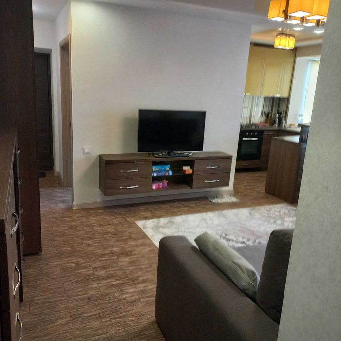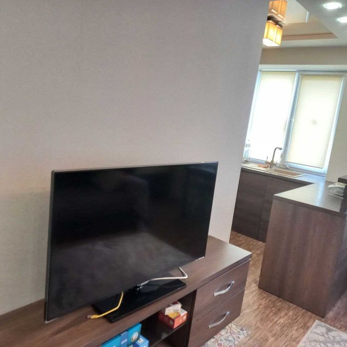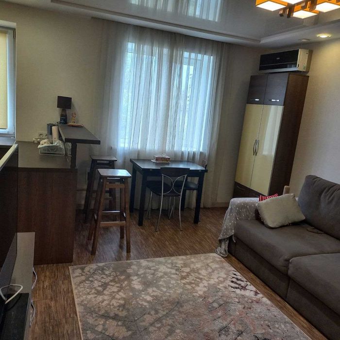 Кухня-вітальня з барною стійкою та стільцями, холодильник, варильна поверхня, бойлер, вбудовані посудомийна та пральна машини, телевізор, кондиціонер, великий модульний диван, шафи та комоди.