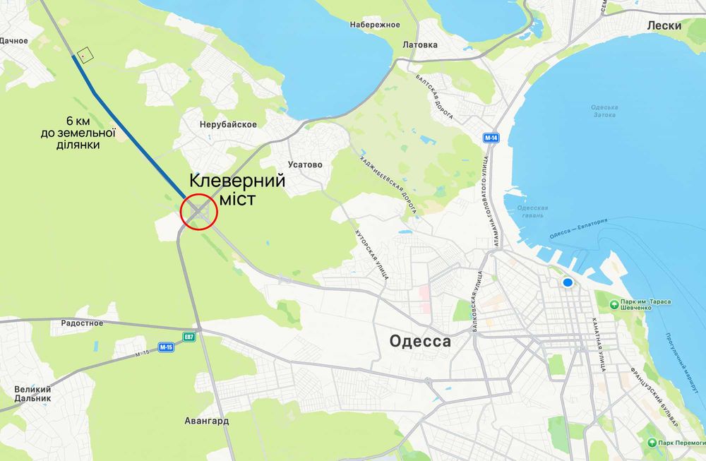 Жирный участок в 6 км от Клеверного моста ОДЕССА-КИЕВ срочная продажа; Продається земельна ділянка 5,6754 га на трасі Одеса–Київ (координати: 46°34'18.7"N 30°34'47.2"E). Кадастровий номер: 5121084200:01:002:0029. Призначення (11.02) – промислова та комерційна забудова (склади, виробництво, логістичні центри, АЗС).
