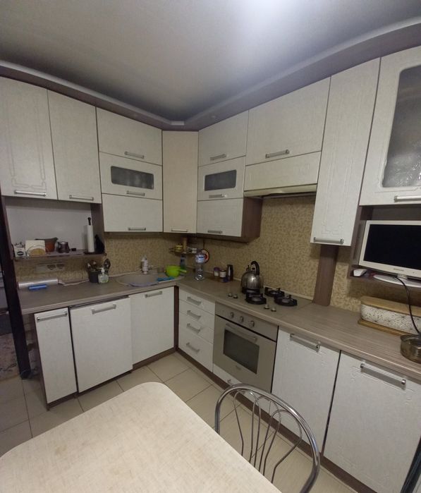В квартирі залишаються вбудовані меблі:3 шафи -купе,кондиціонер,вбудована кухня з технікою(посудомийна машина,духова шафа електрична,газова варильна панель,холодильник).